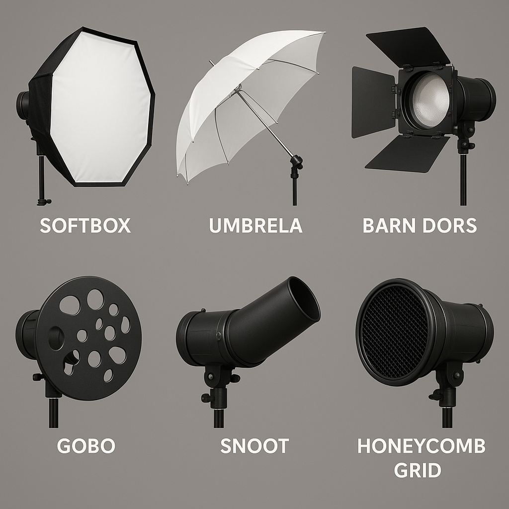 ग्रिड, स्नूट और हनीकॉम्ब अटैचमेंट – इस उपकरण की मदद से प्रकाश स्रोत से आने वाले प्रकाश को हम विभिन्न तरीके से फोकस कर सकते हैं यह है ये अटैचमेंट लाइट को “फोकस्ड” और संकीर्ण नैरो बीम कर देते हैं। उदाहरण के लिए, स्नूट से आप सिर्फ चेहरे पर या किसी छोटे हिस्से पर रोशनी डाल सकते हैं जबकि बाकी जगह अंधेरी रहे। इससे विषय पर नाटकीय इफेक्ट बनाना आसान होता है। Controlling light in photography
