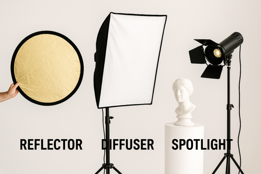 रिफ्लेक्टर का उपयोग रिफ्लेक्टर एक साधारण लेकिन असरदार उपकरण है जो प्राकृतिक या कृत्रिम प्रकाश को वापस विषय की ओर परावर्तित करता है। जब बाहरी प्रकाश बहुत तेज या असंतुलित हो, तो रिफ्लेक्टर की मदद लेकर के हम वंचित स्थान पर प्रकाश प्रक्षेपित कर सकते हैं और यदि अवांछित है छाया है तो उसे भी दूर कर सकते हैं। प्रकाश प्ररावर्तक भिन्न-भिन्न रूप आकार में आते हैं जिससे की फोटोग्राफी में स्थित संसार उनका इस्तेमाल किया जा सके। रिफ्लेक्टर प्रकाश की दिशा बदल सकते हैं या हाइलाइट्स को मुलायम बना सकते हैं। रिफ्लेक्टर गोल, चौकोर, सिल्वर, गोल्डन या डिफ्यूजर वाले कई प्रकार के आते हैं। इनका उपयोग आउटडोर शूट में चेहरे की चमक, गहराई और टेक्सचर को बैलेंस करने के लिए किया जाता है। रिफ्लेक्टर को लगाने के लिए स्टैंड भी आते हैं ।