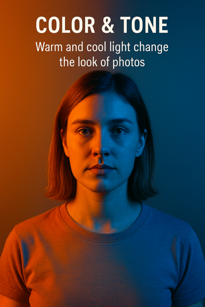 प्रकाश विषय की आकृति को उभारता है। बैक लाइट, रिम लाइट या साइड लाइट विषय के किनारों पर ग्लो बनाकर उसका आकार और स्पष्ट करती है। इससे फोटो में विषय का “फॉर्म” साफ दिखता है। - रंग और टोन नियंत्रित करना – प्रकाश का तापमान को कलर टैम्प्रेचर भी कहते हैं । दिशा फोटो के रंगों को बदलने में प्रकाष की दिषा एवं कलर टैप्रेचर की प्रभावी भूमिका होती है। वॉर्म लाइट को गर्म रोशनी के तौर पर माना जाता है। यह फोटो को पीला एवं नारंगी टोन देती है। वहीं पर जबकि कूल लाइट जिसे नीली रोशनी के रूप में माना जाता है, वह ठंडा प्रभाव देती है। इससे फोटो का समग्र लुक तय होता है।